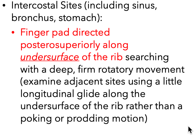 Where do you place your finger pads when finding anything in the intercostal sites?
