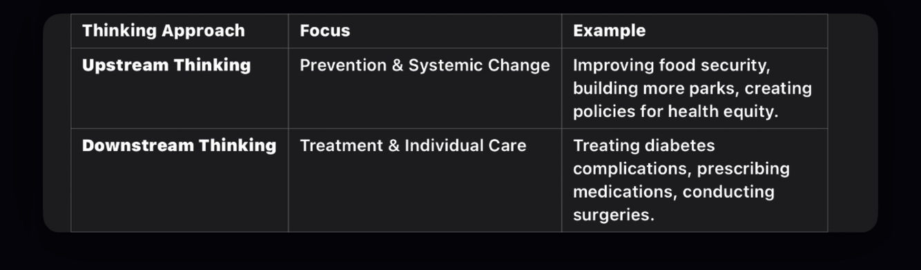 Instead of treating people who develop Type 2 diabetes, upstream thinking improves access to healthy foods, promotes exercise programs, and enforces policies to reduce sugar consumption in communities.