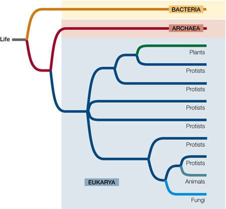 The division of all living organisms into the three major domains (Bacteria, Archaea, and Eukarya; diagram shown here) is based upon