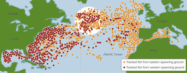 It was believed that imposing strict fishing limits on the North Atlantic Ocean west of the line shown in this figure would protect the western-breeding population from becoming endangered. Based on the data shown in the figure, what do the tracking results show?