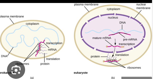 In eukaryotes, DNA is enclosed in the nucleus, while ribosomes are in the cytoplasm. mRNA must first be fully transcribed and processed, then exported through nuclear pores, so transcription and translation cannot occur simultaneously.