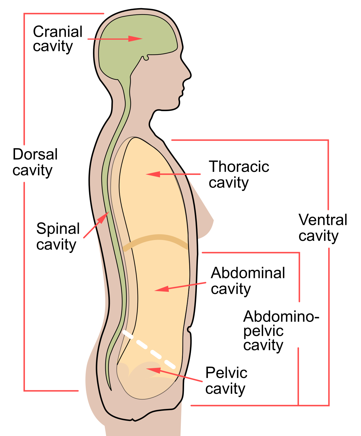This cavity is divided into the Thoracic (chest) cavity, and the abdominopelvic cavity
