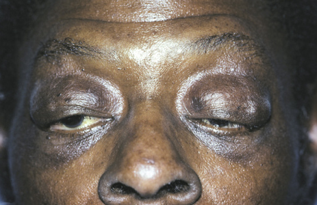 ascher syndrome, as depicted by edema of the upper eyelids (blepharochalasis)
