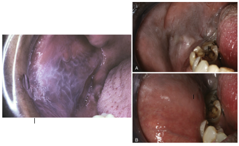 whiteness disappears when buccal mucosa is stretched (lower right picture)