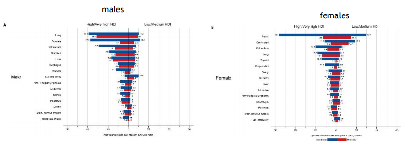 Look at this figure closely and remember which types of cancer are most common/most fatal/least fatal. But also look at the left and right side of both graphs, where it’s displayed what cancers are most common in high or low incomes (high/low HDI) (for illustration).
