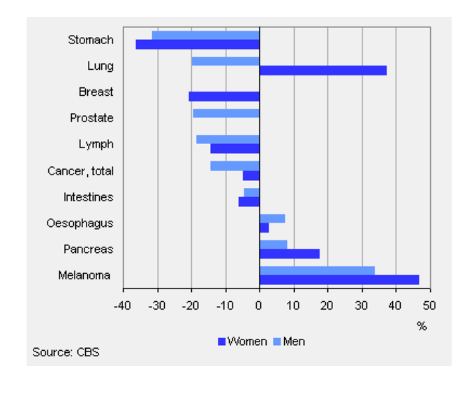 This figure displays mortality trends of 2010 vs 2000 of some cancer in women and men. One thing is strikingly different. Name this difference and explain it.