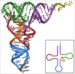 (shown: The cloverleaf structure of Yeast tRNAPhe (inset) and its 3D structure determined by X-ray analysis.)