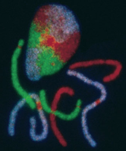 Because homologous chromosomes are virtually identical, they carry the same genes in the same relative positions. Thus, in diploids, each gene is present as a gene pair. However, notice in Figure 1-6 (shown) that, although the nucleus in a body (somatic) cell contains pairs of chromosomes, they are not physically paired in the sense of being next to each other. The chromosomes of the ruptured nucleus shown in the lower part of the image reveal no pairing. Notice also that the upper part of the image shows an intact nucleus from another cell, and here again, the chromosomes are clearly not in a paired state; for example, the members of the violet pair are at opposite ends of the nucleus. However, the physical pairing of homologs does take place in the nuclear division known as meiosis.