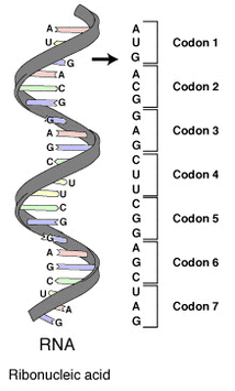 Shown: A series of codons in part of a messenger RNA (mRNA) molecule. The nucleotides are abbreviated with the letters A, U, G and C. This is mRNA, which uses U (uracil). DNA uses T (thymine) instead. This mRNA molecule will instruct a ribosometo synthesize a protein according to this code.