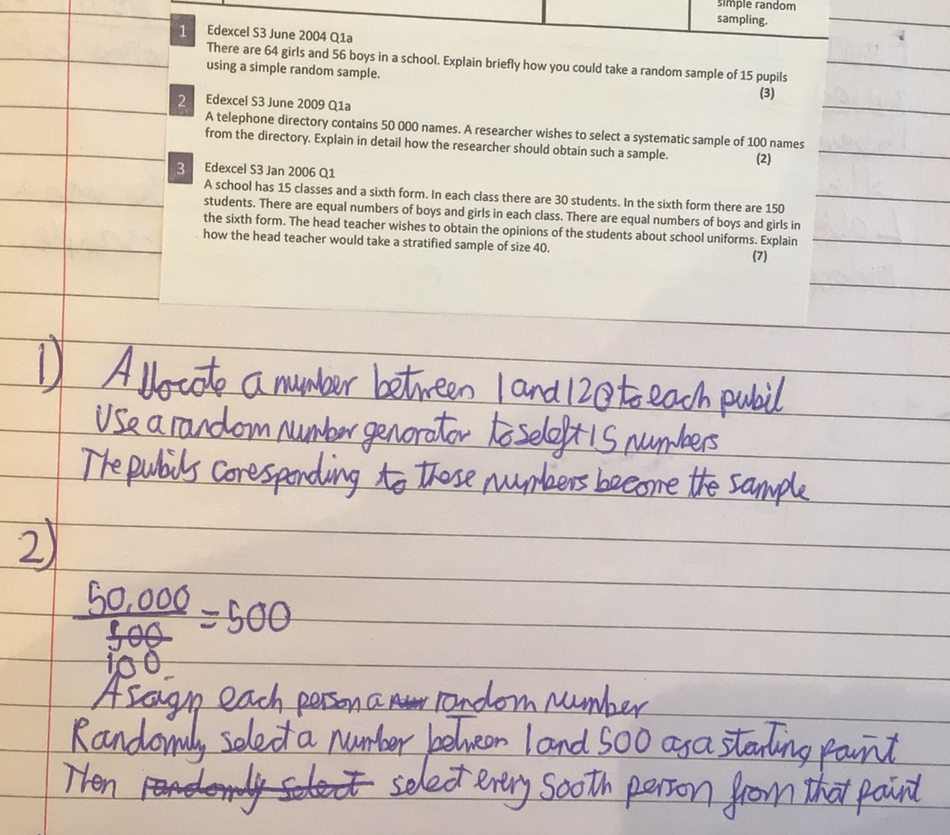 Explain how you would sample inside each group. If the question doesn’t say use simple random sample as it is easier. Make sure to be using exact info. Eg from the class register. Number 1 - y. Random number generator