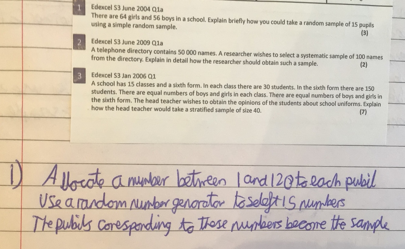 Explain how you would sample inside each group. If the question doesn’t say use simple random sample as it is easier. Make sure to be using exact info. Eg from the class register. Number 1 - y. Random number generator