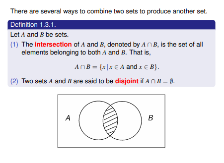 Intersection - The intersection of A and B, denoted by A ∩ B, is the set of all elements belonging to both A and B.