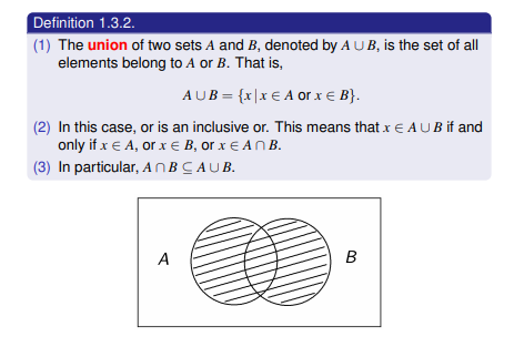 Union - The union of two sets A and B, denoted by A ∪ B, is the set of all elements belong to A or B.