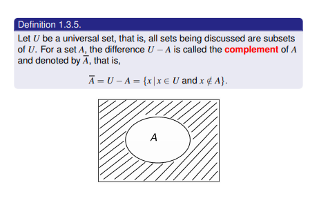 Complement- Let U be the universal set that is all sets being discussed are subsets of U.For set A, the difference of U - A is called the complement of A and denoted A(over line on top)