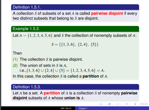 Pairwise Disjoint- A Collection S of subsets of a set A is called pairwise disjoint if every two distinct subsets that belong to S are disjoint.