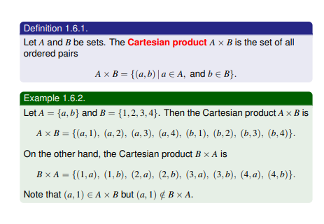 A × B = {(a, b) | a ∈ A, and b ∈ B}.