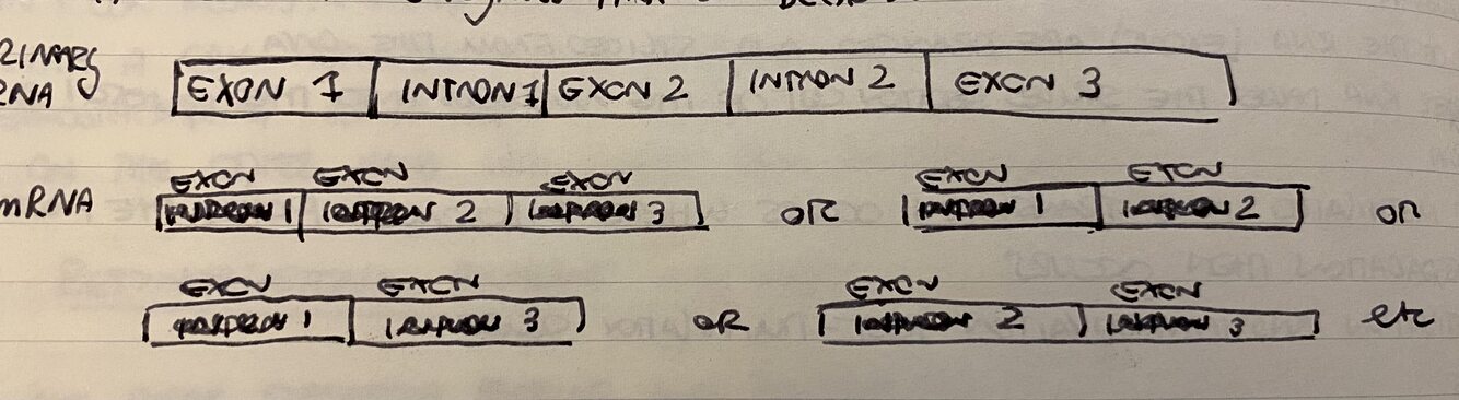 Introns are eliminated alternatively and exons scrambled to make different proteins