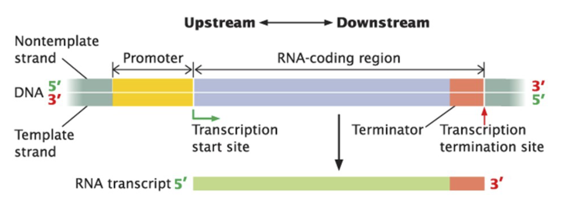 Where transcription starts. A DNA sequence that lies upstream of the RNA coding region, serves as an indicator of where and in which direction transcription should proceed. The promoter is not actually transcribed; its role is purely regulatory.