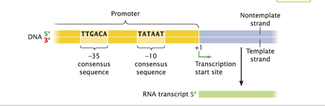 Location of the consensus sequence determines the position of the start site. During initial RNA synthesis, no primer is required.