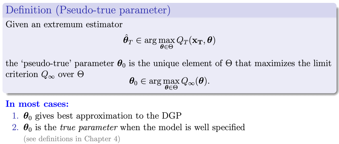 What is the definition of a Pseudo-true parameter? What does this parameter imply (name two)