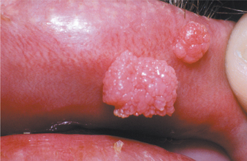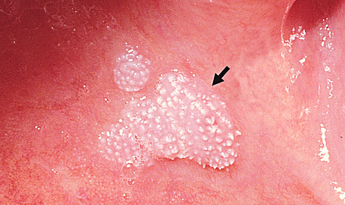 Clinically –> Painless, Sessile (short blunted surface projection), Exophytic, Clustered