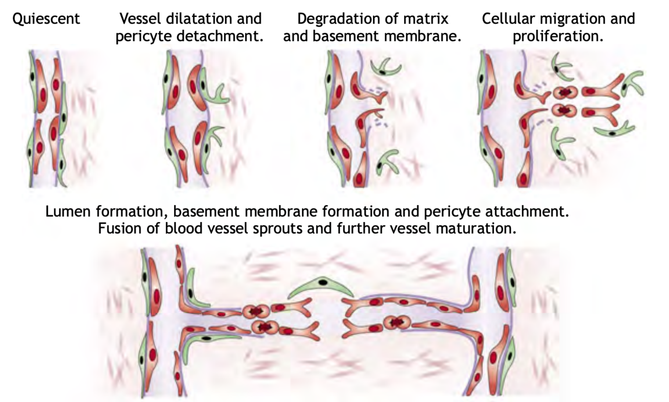Angiogenesis is a multistep endothelial cell process. What are the different steps (5)?