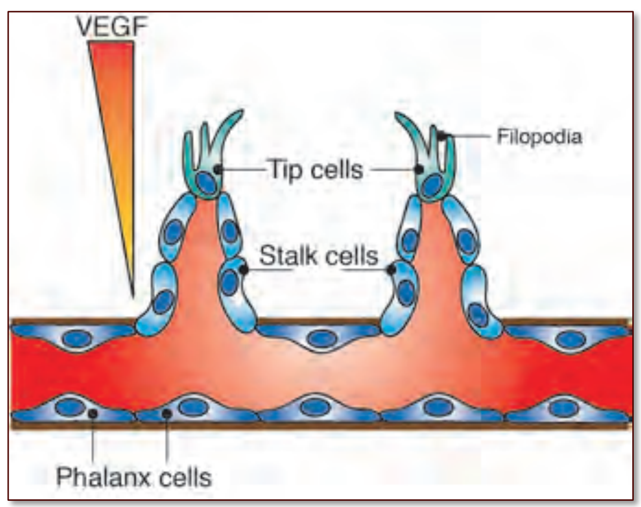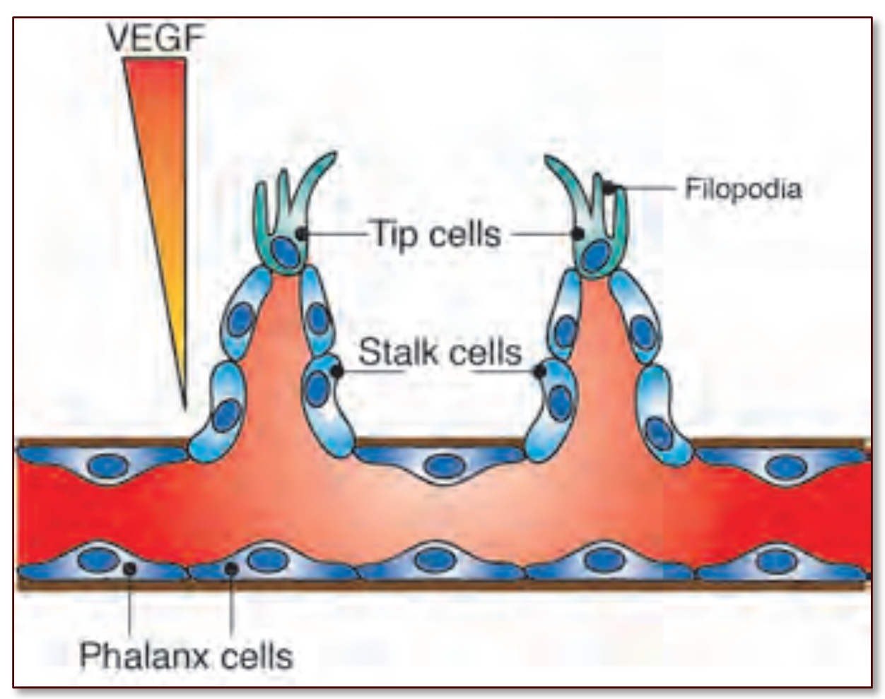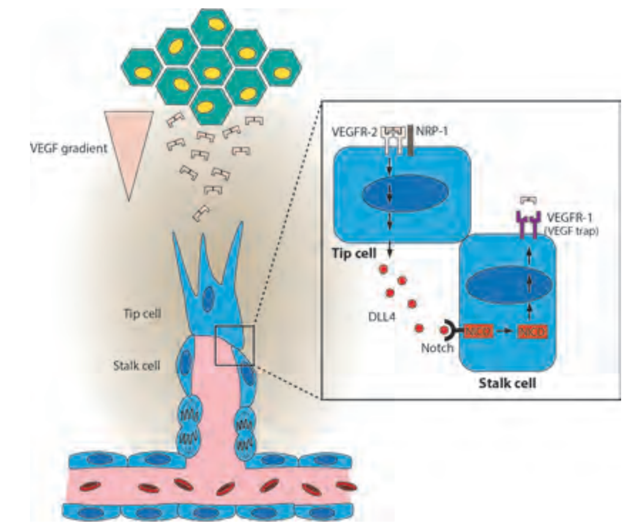 Cells with high VEGFR-2 will turn into tip cells and increase expression of secretion of DLL4. The underlying cells have more Notch and more sensitive to DLL4. Activation of Notch will lead to activation of proliferation thereby the stalk cell. At the same time stalk cells will express more VEGFR-1 which makes them less sensitive to VEGF thereby preventing these cells to switch to a tip cell phenotype