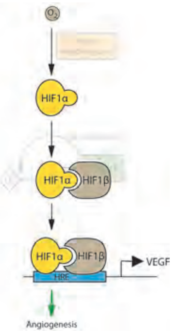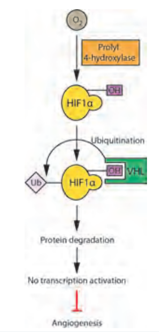In presence of oxygen, propyl 4-hydroxylase will hydrolyse the HIF-1-alfa. This hydroxylated state can recruit VHL (amongst other proteins) which will ubiquitinate HIF-1-alfa. HIF-1-alfa will then be degraded, so no transcription of angiogenesis is induced.