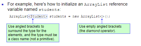 ArrayList(element-type) reference-variable = new ArrayList<>();
