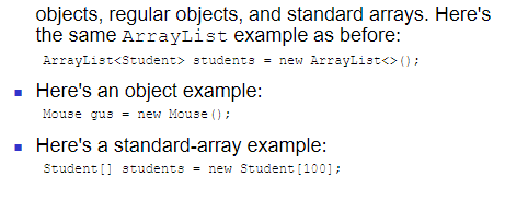 Comparative Syntax for creating ArrayList objects, regular objects and standard Arrays