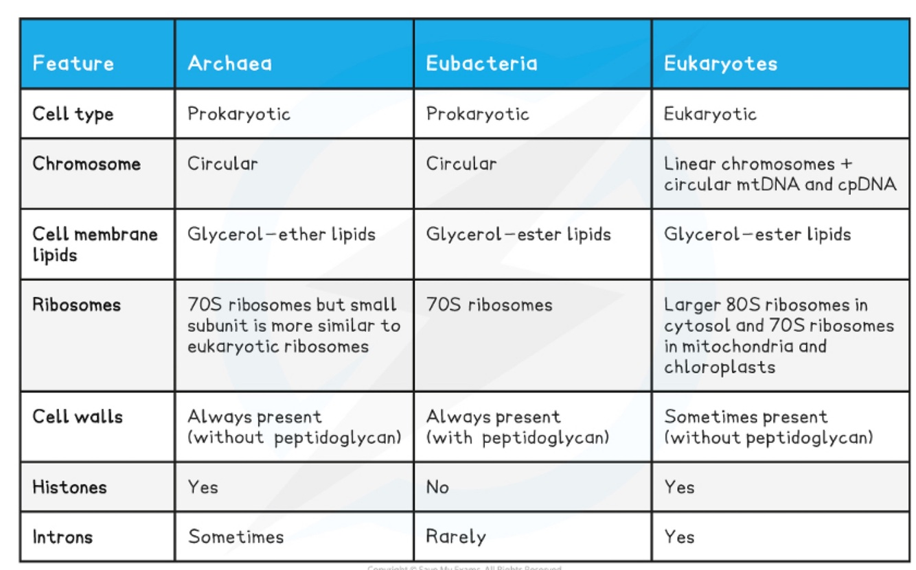 Overall comparison table between archaea / bacteria / eukarya = cell type / chromosome / cell membrane lipids / ribosomes / cell walls / histones