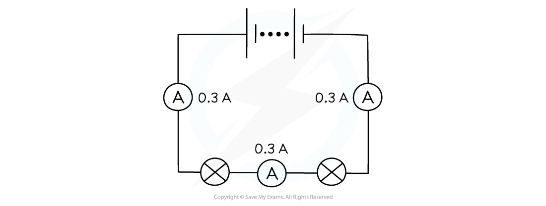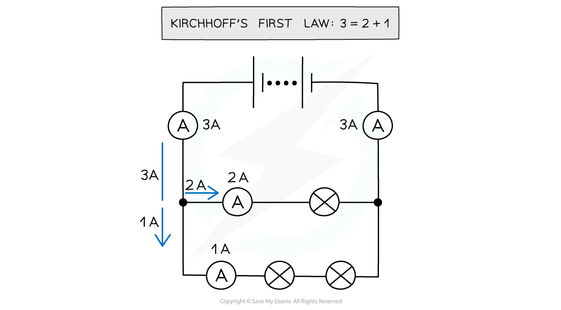 In a parallel circuit, the current …. at the junctions and each branch has a different value. Kirchhoff’s first law applies at each junction