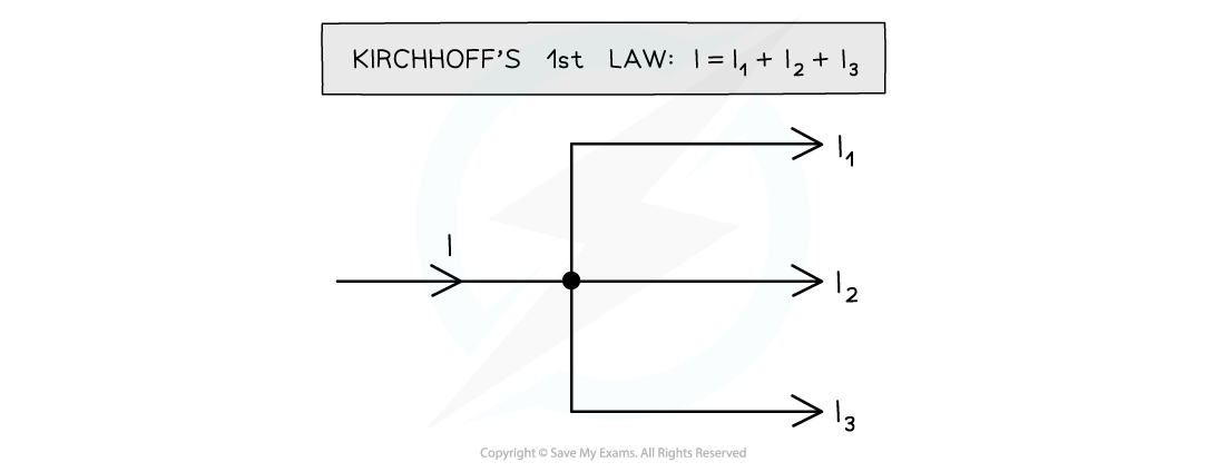In a parallel circuit, the current …. at the junctions and each branch has a different value. Kirchhoff’s first law applies at each junction