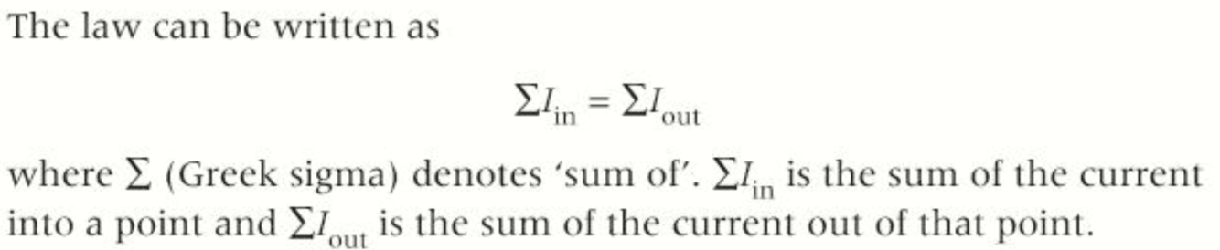 Kirchhoff’s First Law is that the sum of current entering a point is the same as the sum of the current leaving that point: It uses the conservation of charge.
