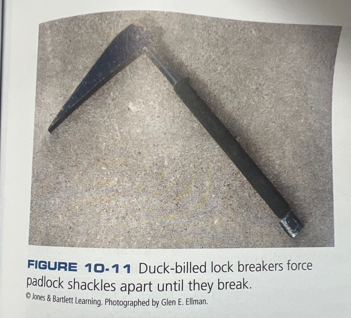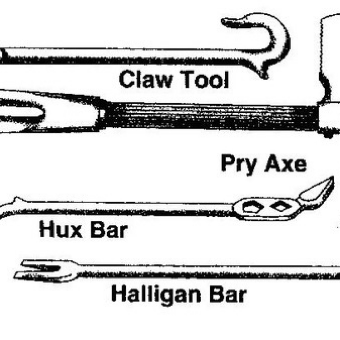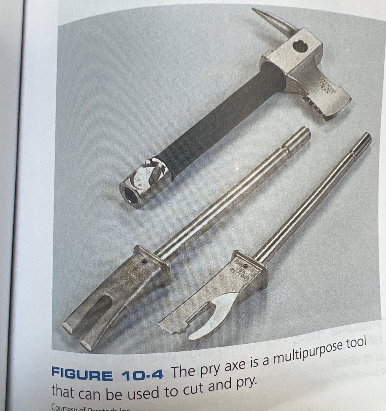 A multipurpose tool that can be used both to cut and to force open doors and windows (Fig 10.4). It includes an Adze end, a pick, and a fork or claw.