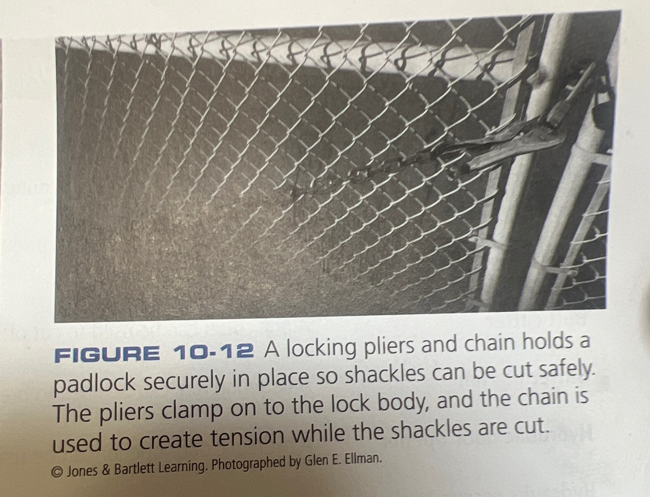 Used to clamp a padlock securely in place so that the shackles can be cut safely with a circular saw or cutting torch. One FF clamps the pliers to the lock body while a second FF maintains a steady tension on the chain as the lock is being cut.