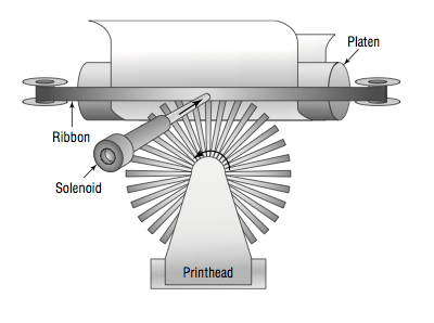 These printers use a form of impact on an inked ribbon to make an imprint on paper – like a typewriter.