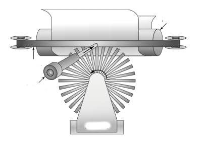 A hammer strikes the back of the desired petal against a print ribbon, over paper, producing the letter.