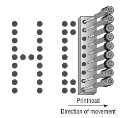 A dot-matrix printer doesn’t have a daisy-wheel with characters on it. Instead, it has a print head with a row of pints that are triggered in patters to hit the paper, forming letters.