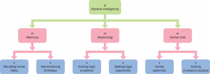 most intelligence test data are best described by a three-level hierarchy with general intelligence at the top, specific abilities at the bottom (recalling movie titiles or giving speeches), and a small number of middle-level abilities in the middle (memory or verbal skills)