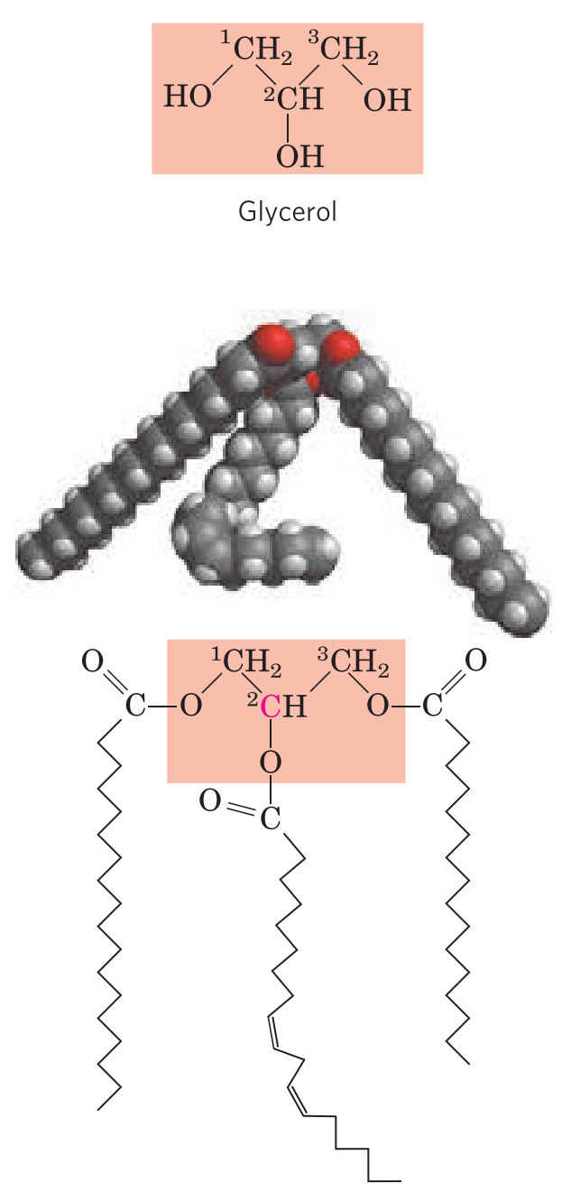 The mixed triacylglycerol shown here has three different fatty acids attached to the glycerol backbone