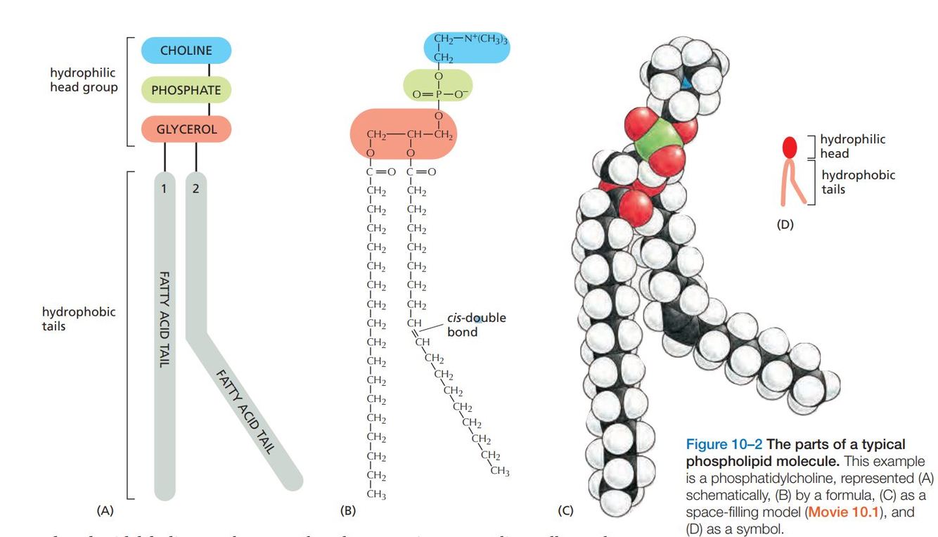 most abundant membrane lipids polar head with phosphate group and 2 hydrophobic carbon tails fatty acids in animal, plant, and bacterial cells one tail is unsaturated (one or more cis double bonds) and the other is usually saturated