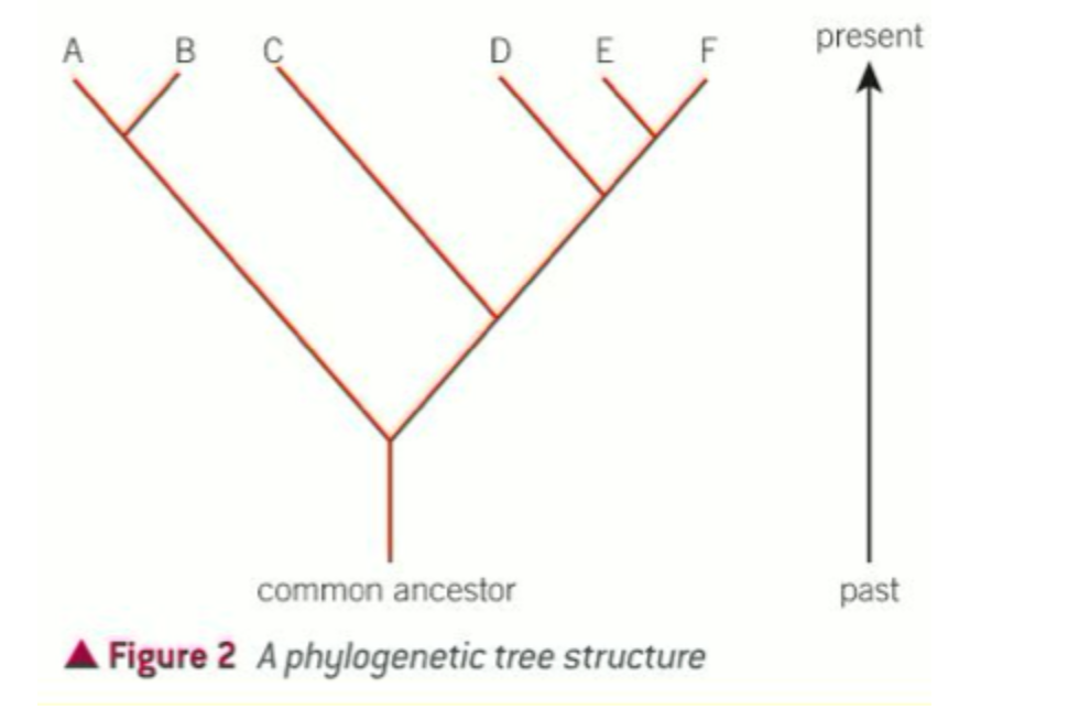 The letters A-F represent six different species that have evolved from this ancestor. Then look at the top of the tree.