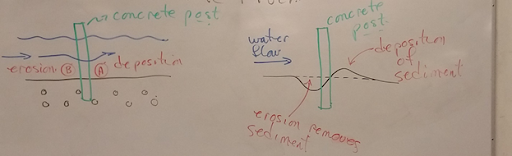 At (A), as water moves around the concrete post in the river, turbulence increases and water velocity drops on the lee slide/down current side. At (B), water velocity increases as it accelerates around the post. The end result is scouring (erosion) of sediment away from the front of the position and deposition of a pile of sediment behind it.