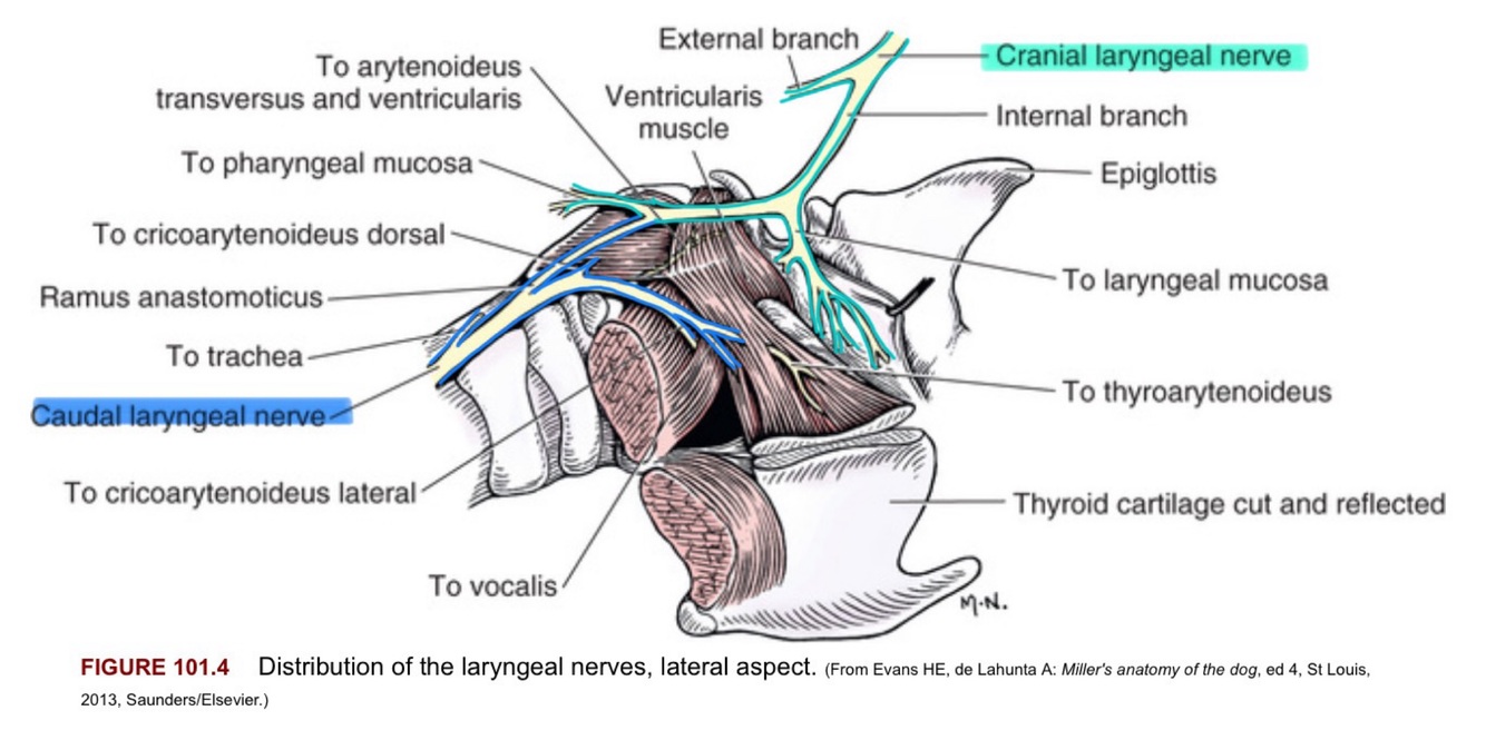 Larynx innervated by cranial and caudal laryngeal nerves which originate from the vagus nerve