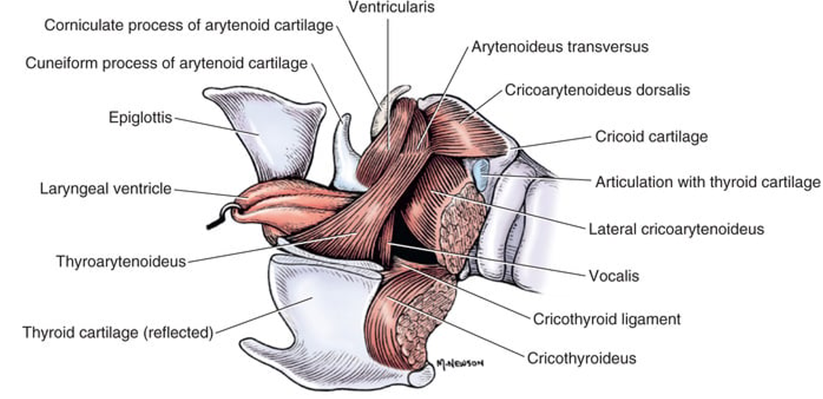 Cricoarytenoideus dorsalis: Abducts arytenoid cartilage to open the glottis