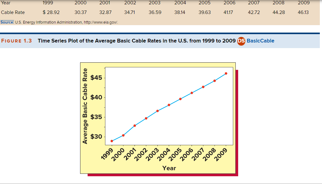 A runs plot, such as Figure 1.3, displays each data point on the vertical scale against its corresponding time index (year) on the horizontal scale, illustrating changes or trends over time.