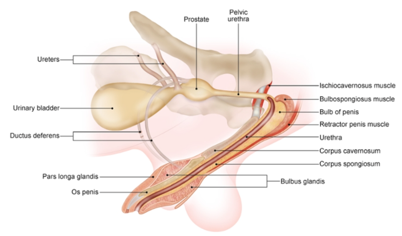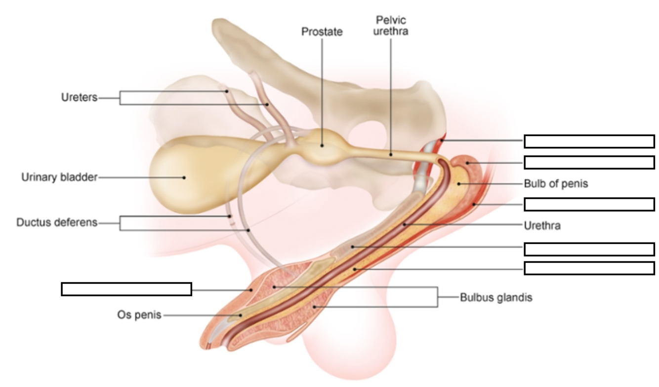 Enter prostate dorsally then into urethra via slits on each side of colliculus seminalis.