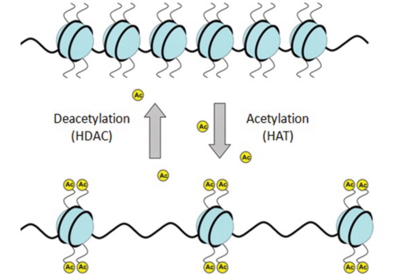 When acetyls are added to histone, which pull the tightly packed DNA strand away from histone which makes it looser. This loosely packed DNA can now be transcribed. Adding and taking away acetyls can turn off and on a gene.