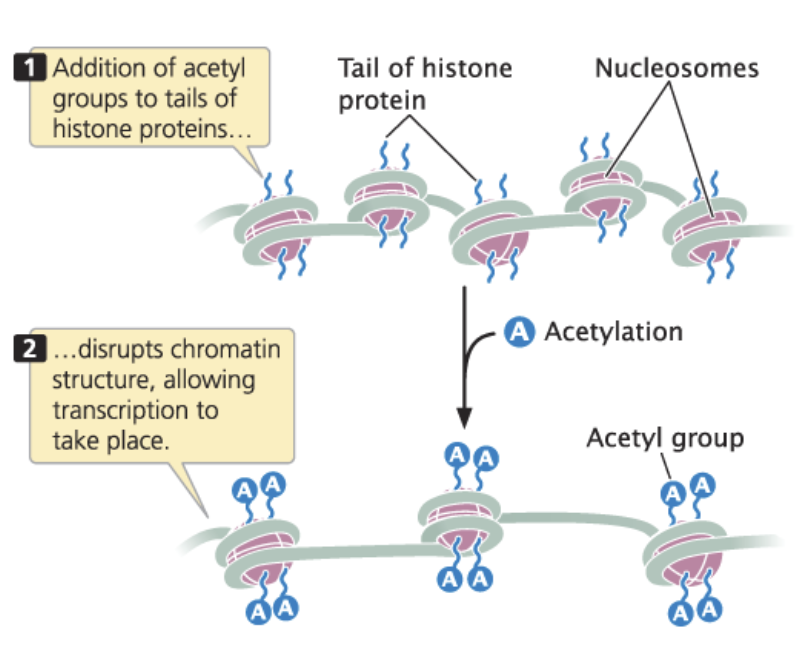 Histones have tails that have a positive charge, DNA has a negative charge. Represents a type of epigenetic modification.